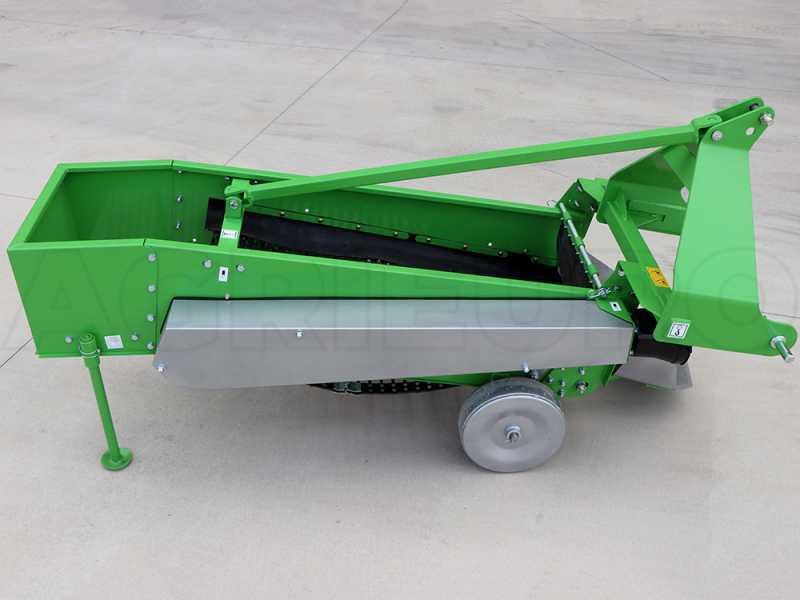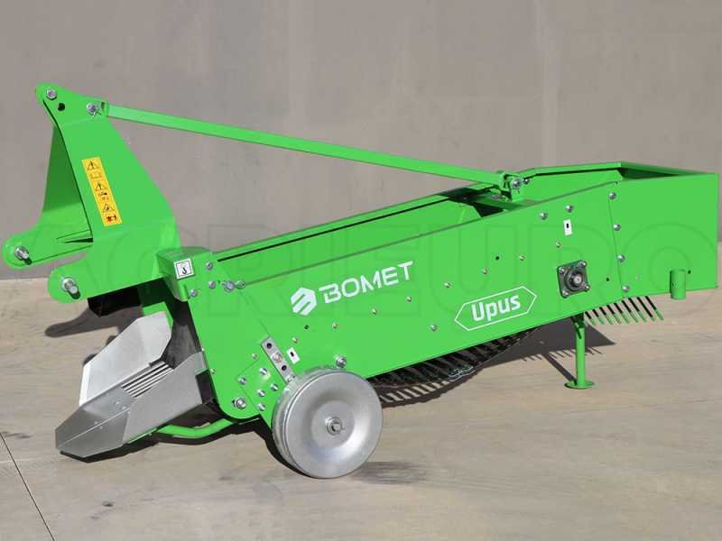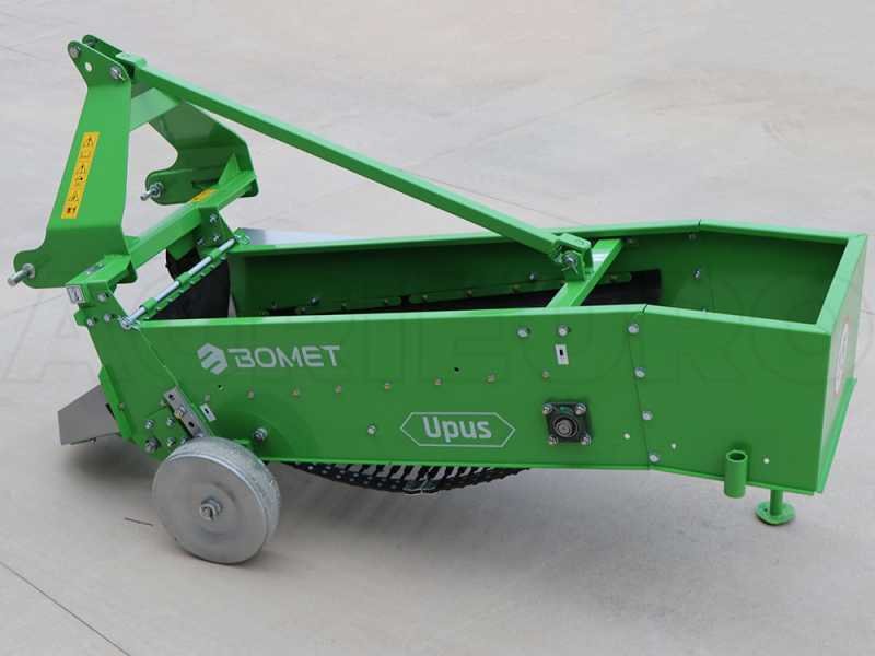 L’arracheuse de pommes de terre Bomet UPUS (à rangée simple) est une machine qui monte un système de suspension à trois points et qui est entraînée par un arbre à cardan à la prise de force du tracteur. La crête avec les pommes de terre est déchaussée par un soc, puis est dirigée vers la grille.