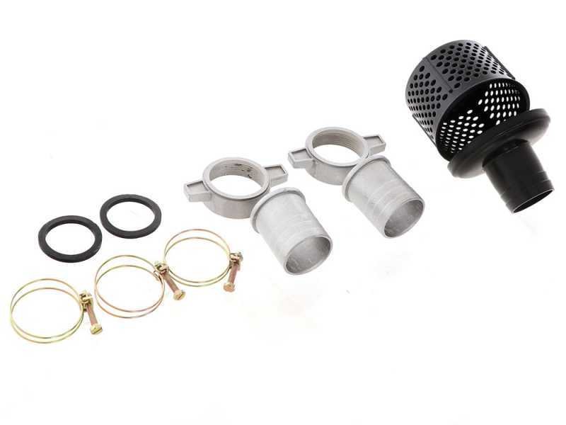 Inclus : 2 raccords de 50 mm, 3 brides métalliques et 2 joints en caoutchouc pour les raccords ainsi que le filtre de fond pour l’aspiration.